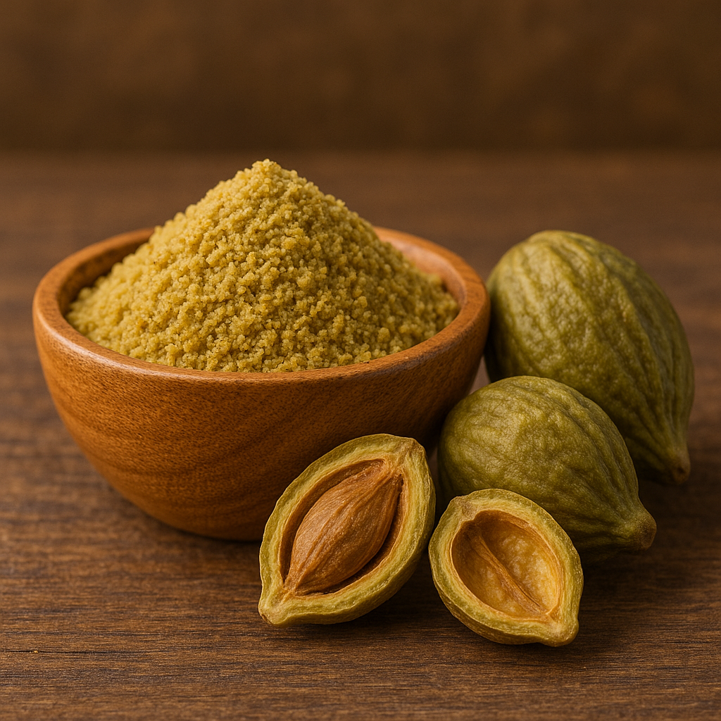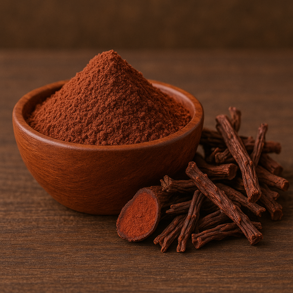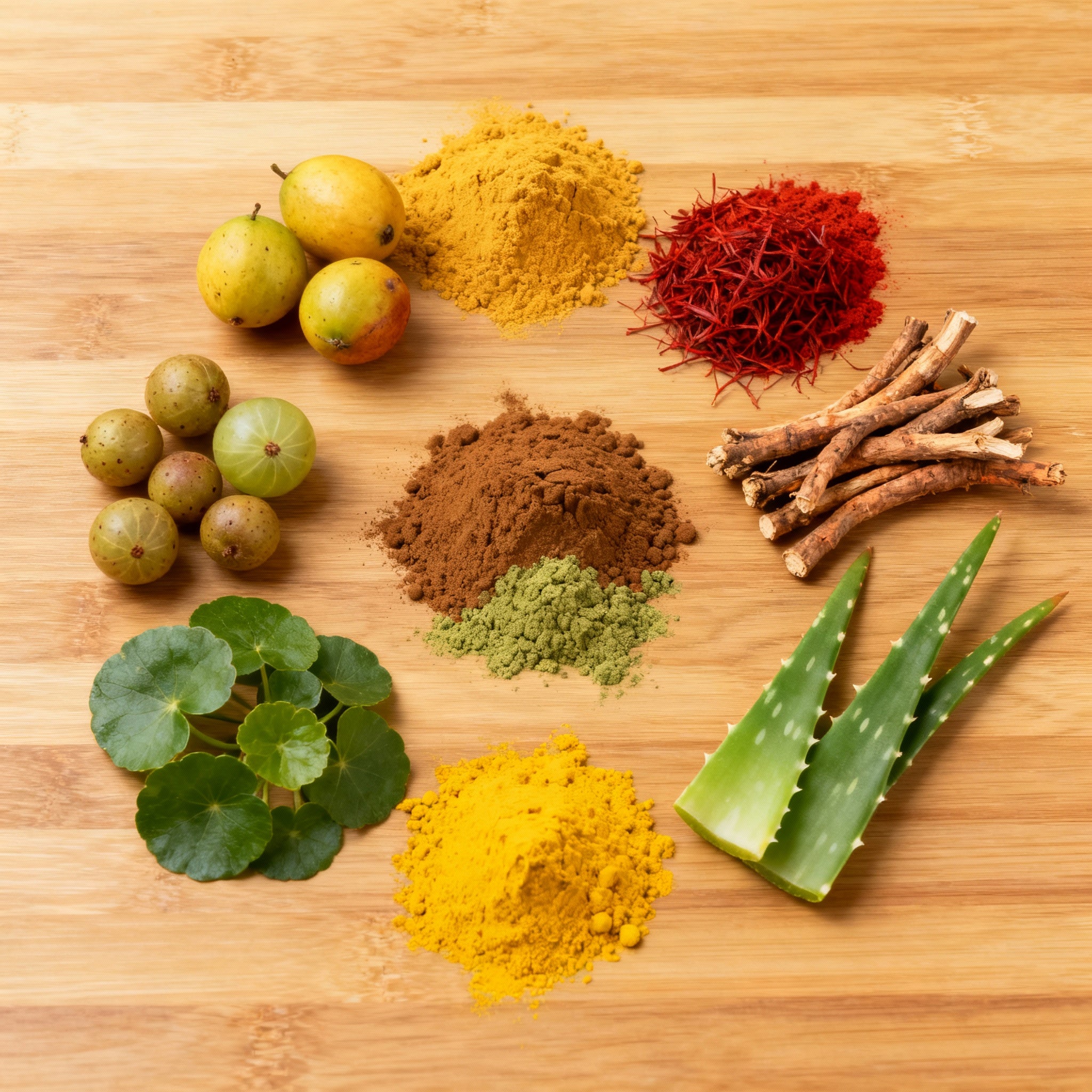 Harida (reduces inflammation, redness), Manjista (fades scars, pigmentation), Amla (soothes, cools), Gotu Kola (heals cracks, restores skin barrier), Kumari (deeply hydrates), Gandhak (prevents infection).